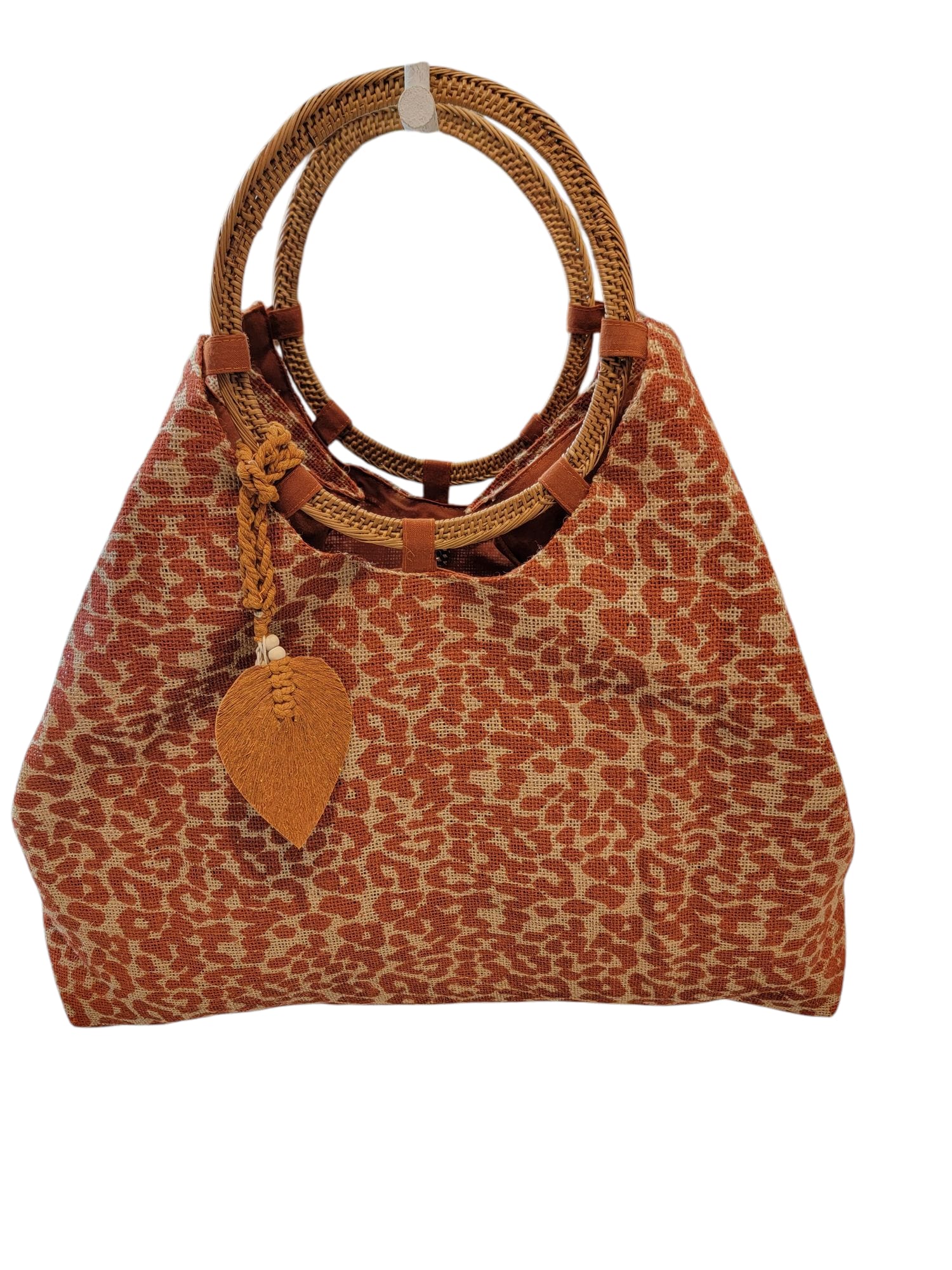 borsa grande in iuta con manici tondi in rattan. Stampa maculata colore terracotta. Perfetta per il mare e per lo shopping.Misura lunghezza 50cm altezza 45cm :disponibile pochette abbinata