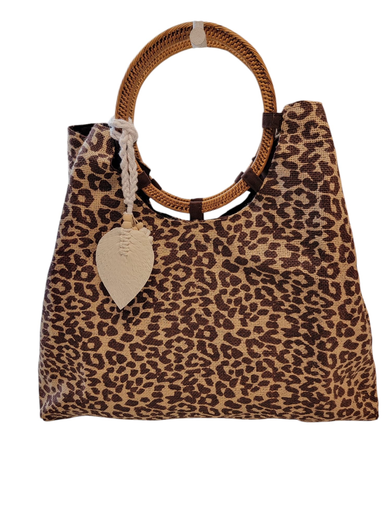 borsa grande in iuta con manici tondi in rattan. Stampa maculata ,colore marrone.Perfetta per il mare e per lo shopping.