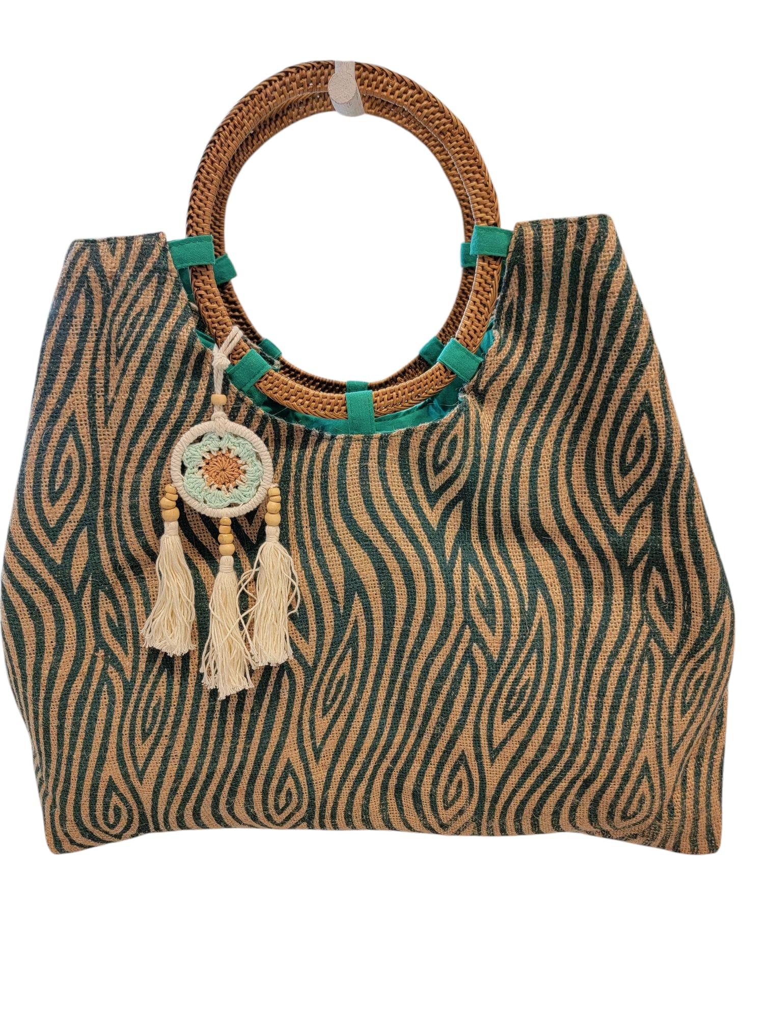 Borsa grande in iuta con manici tondi in rattan Stampa zebra ,colore verde acqua. perfetta per il mare e per lo shopping .Misura lunghezza 50cm ,Altezza 45cm .disponibile pochette abbinata