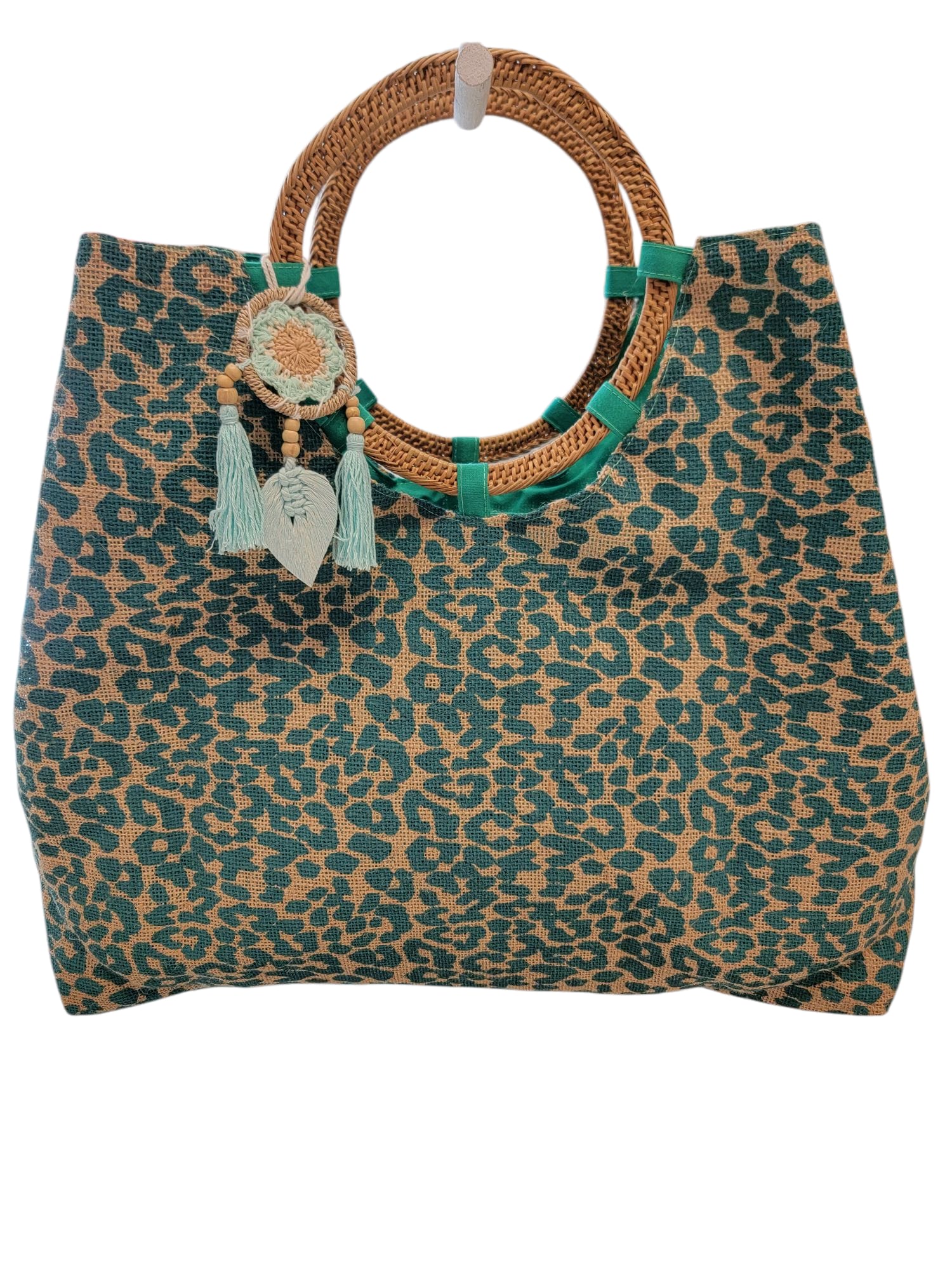 borsa grande con manici tondi in rattan .Stampa maculata ,colore verde acqua.Perfetta per il mare o per lo shopping, Misura lunghezza 50cm,altezza 45cm-Disponibile pochette abbinata